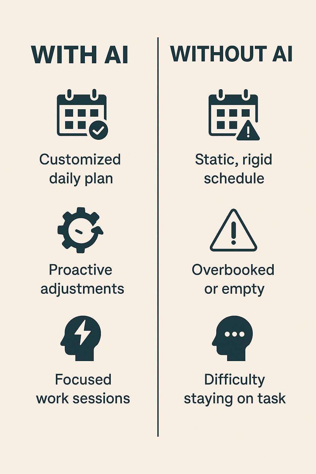 In short, AI becomes your productivity coach, planner, and mirror—all in one. It doesn’t just help you plan your day—it helps you evolve it over time.
